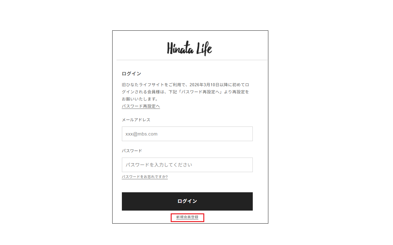 ①リニューアル後、ひなたライフより以下のご案内メールをお送りします。メールを開き、本文中のURLを押してください。≪送信元:info@hinatalife.com≫≪件名:【重要なお知らせ】ひなたライフ サイトリニューアルに伴うパスワード再設定のお願い≫