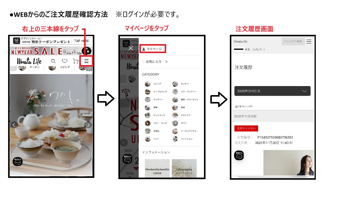 ログイン後、サイト右上の三本線をタップ→マイページを選択→注文履歴が表示されます。