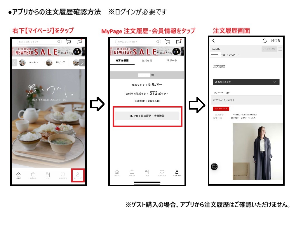 ※ゲスト購入の場合、アプリから注文履歴はご確認いただけません。