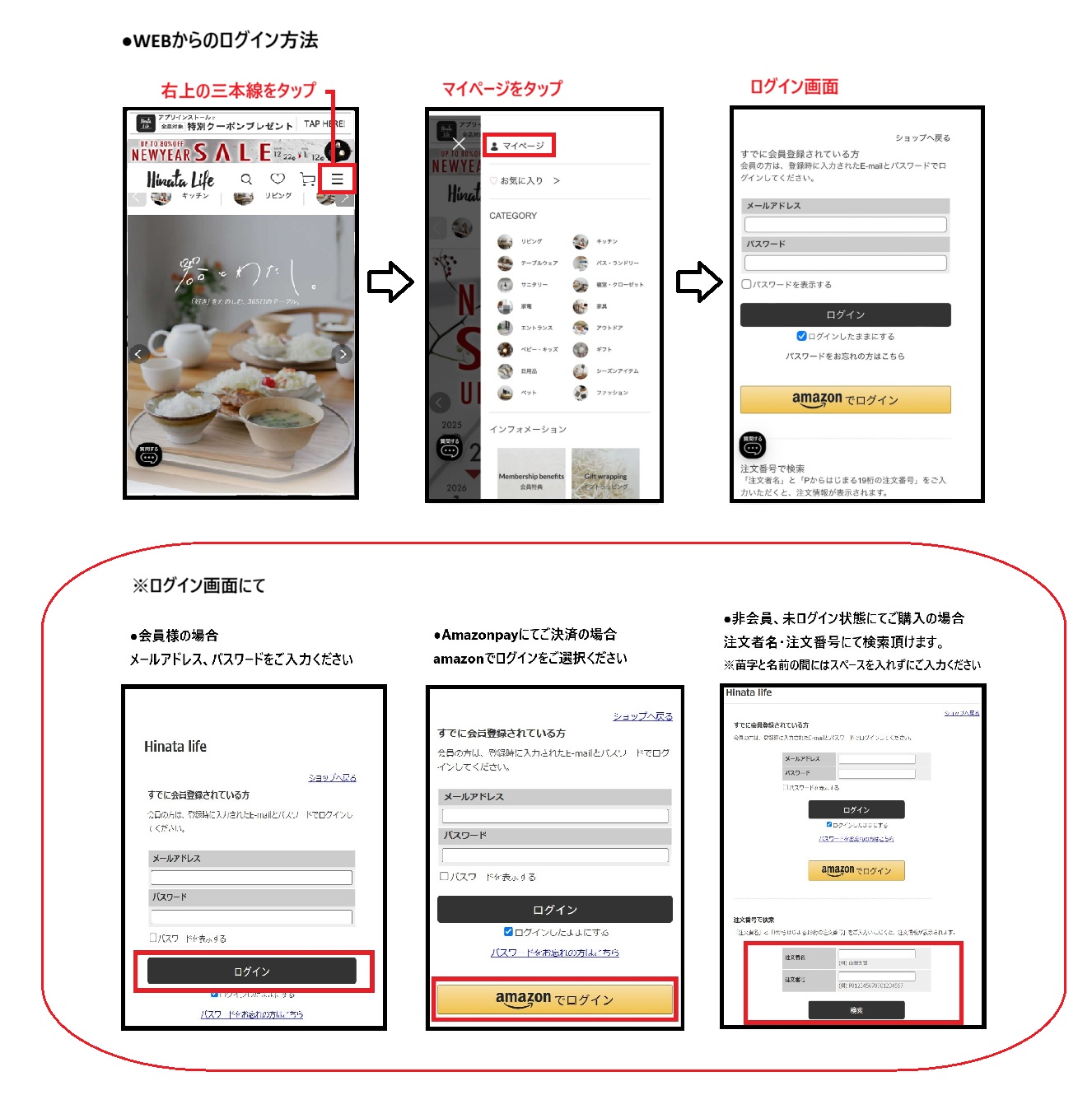 ➁ひなたライフ会員購入・Amazonアカウントにて購入・ゲスト購入(未ログイン状態)により、ログイン方法が異なりますので以下をご確認ください。