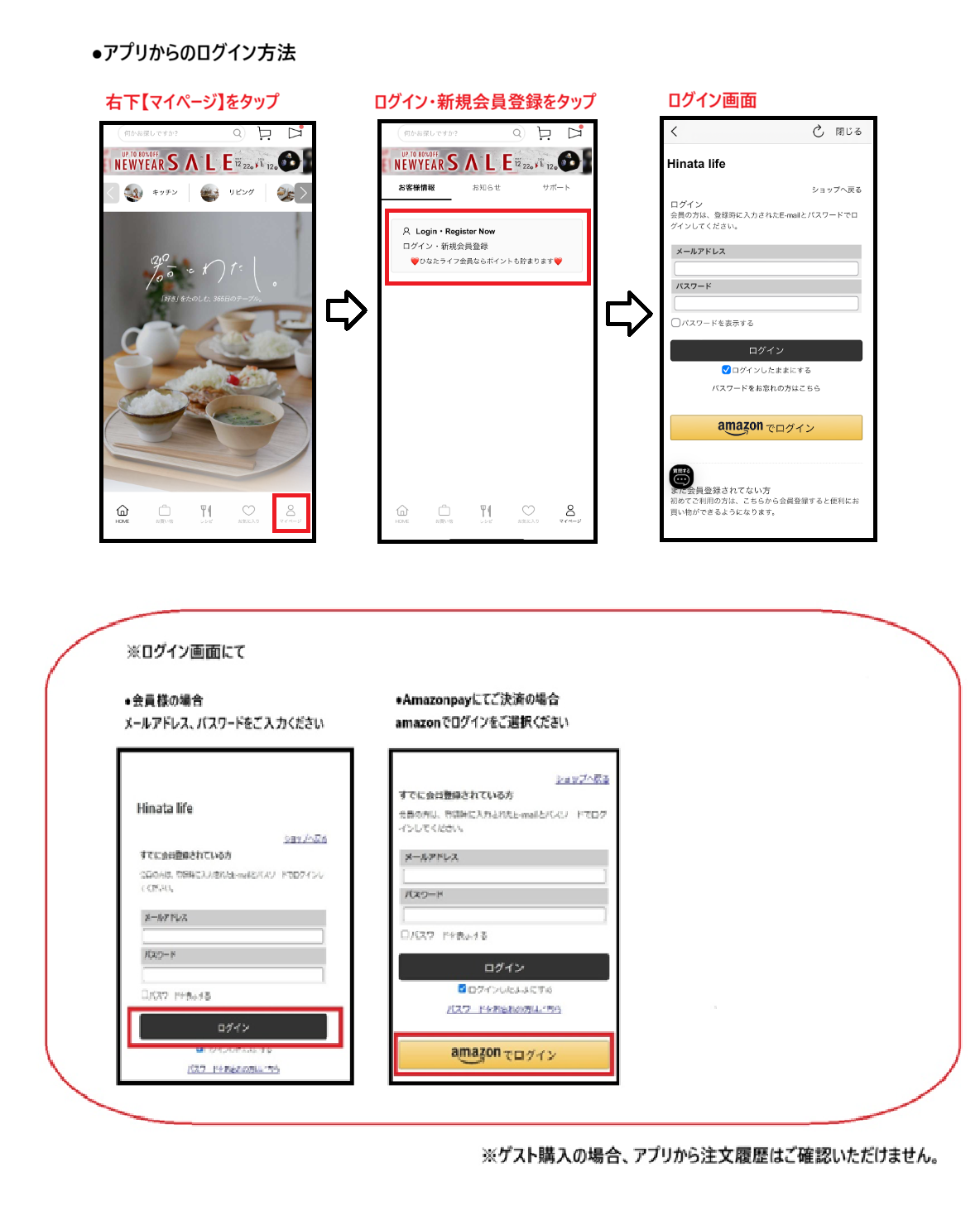 ゲスト購入・Amazonアカウントでご注文の場合はログイン方法が異なります。